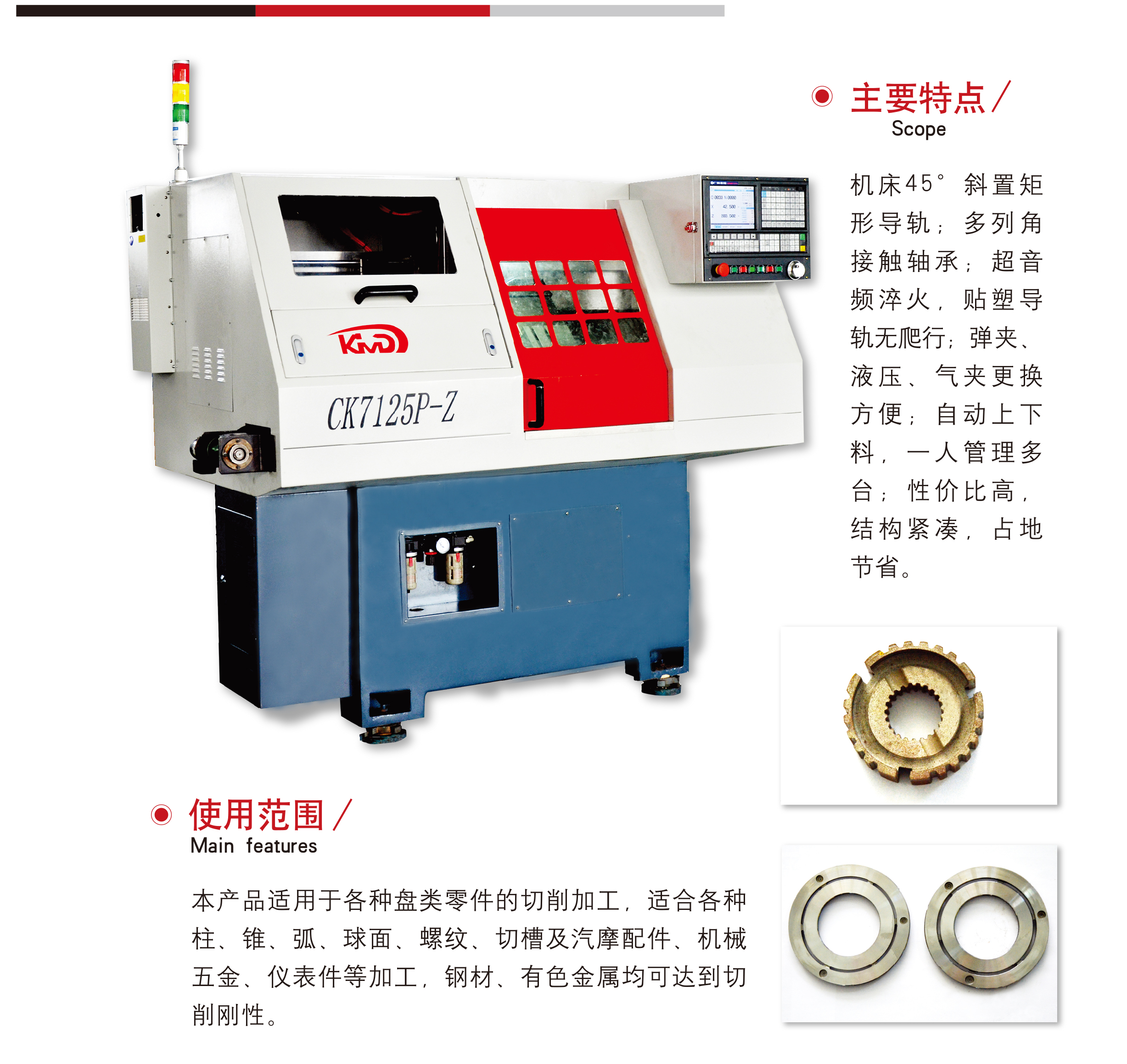 簡要描(miao)述: 機床45°斜置矩(ju)形導軌;多列角(jiao)接觸軸承;超音(yin)頻淬火, 貼🔞塑導(dao)軌無爬行;彈夾(jia)、液壓、氣夾更換(huan)方便;自動上 下(xia)料,一人管理多(duō)台;性價比高,結(jie)構緊湊,占地節(jiē)省。