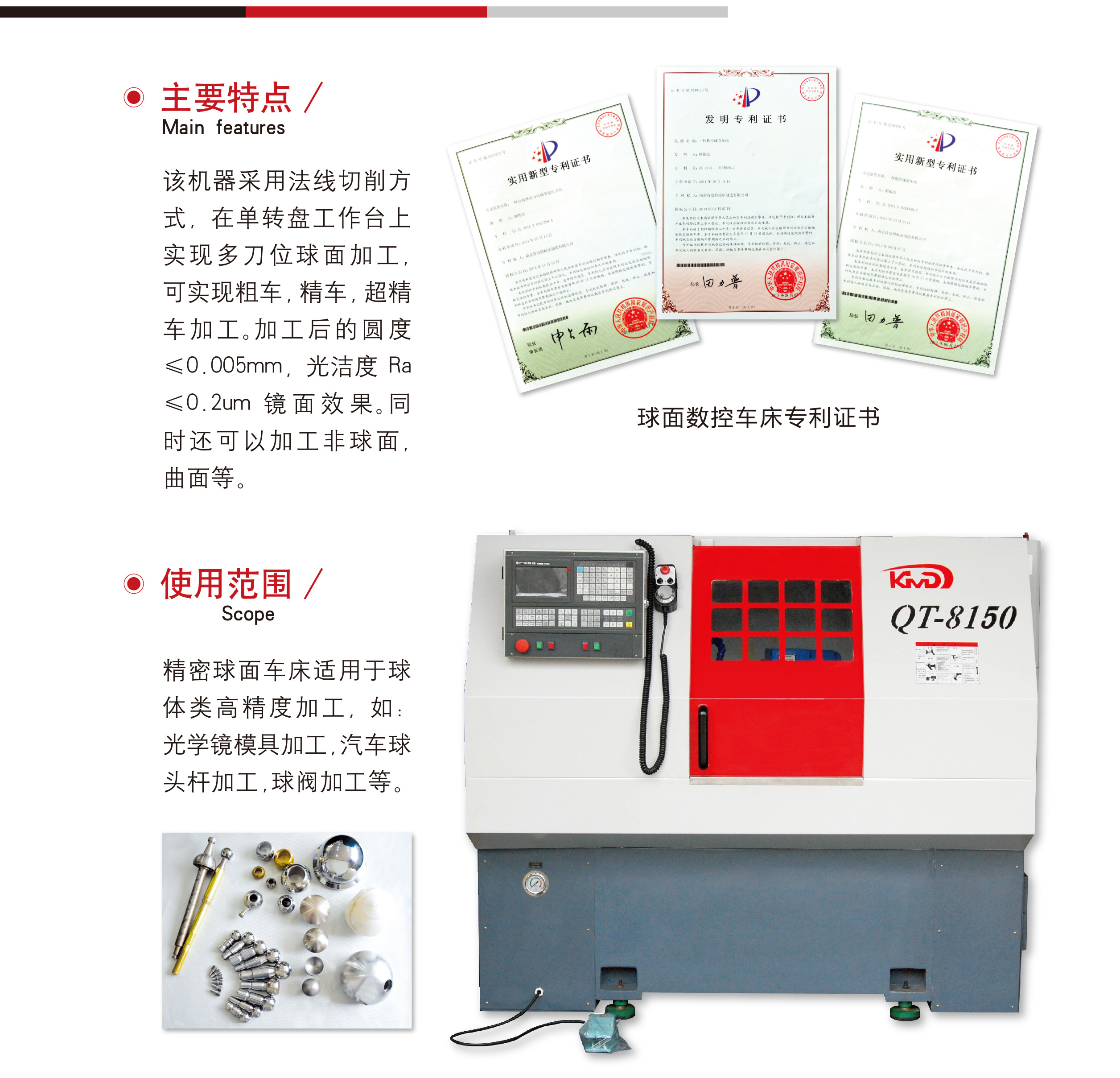 簡(jiǎn)要描述: 該機(jī)器采用法線(xiàn)切削方式,在(zai)單轉盤工作(zuò)台上實現多(duo)刀位球面加(jiā)工,可實現粗(cū)車,精車,超精(jing)車加工。加工(gong)後的圓度≤0.005mm,光(guāng)潔度Ra≤0.2um鏡⚽面效(xiào)果。同時還可(kě)以加工非球(qiú)面,曲面等。